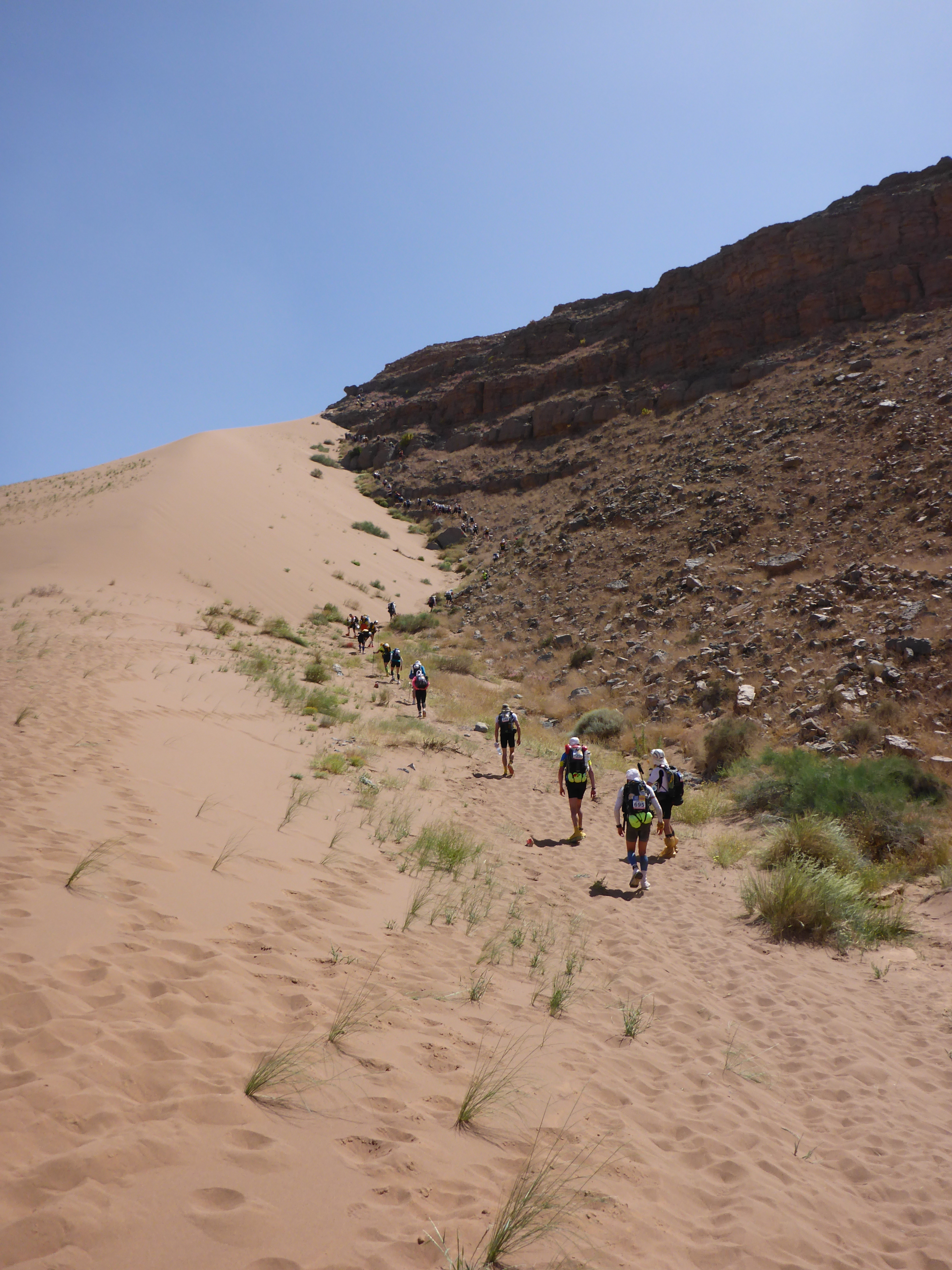 At daybreak we were informed of a new time zone ‘race time’. It was actually only 6am when we thought it was 7am. ETAPE1_E_SAMPERS_MDS2015-6666That left 3 hours till the start. Before we set off we formed a 30 shape to represent the 30th anniversary of the race. You can just see the Yorkshire flag in the bottom right of the zero. Then there was 30 minutes of race briefing/welcome from race organiser Patrick Bauer – in French. The English translation lasted about 1 minute. Good luck – stay safe! John and I got separated from the rest of our tent and ended up starting with some of our our tent neighbours.P1000072 We slowly caught and passed all our tent mates. Jay ran with us for a while. It took at least an hour to catch Fe and Simon. The stage started flat with some small climbs throughout the day. Tent mates Paul and Ben passed us again in a check point while we were having a routine change of socks (blister prevention). We later caught them again and spent an hour or so all together. Day one finished with a climb and a descent into camp. We ran strong into the finish. All of tent 115 back safe and not long between us.